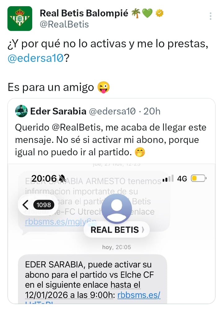 Lo verdaderamente interesante llega después. La respuesta del Betis no es institucional, ni fría, ni calculada. Todo lo contrario. Con tono cercano y una ironía muy reconocible, el club le contesta públicamente: “¿Y por qué no lo activas y me lo prestas? Es para un amigo”. Una frase corta, directa y con guiño incluido, que dice mucho sin necesidad de explicaciones.