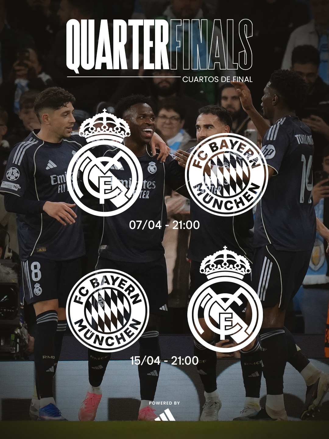 Estos cuartos de final se presentan como un enigma absoluto etiquetando la serie como una final anticipada. Un resiliente Real Madrid se enfrenta a un voraz y constante Bayern de Munich; Un duelo que trasciende lo táctico para también entrar a un terreno de resistencia mental. Un encuentro donde las actualidades pierden peso cuando suena el himno de la competencia, dejando como incógnita, el ver que equipo impone su identidad en medio del caos.